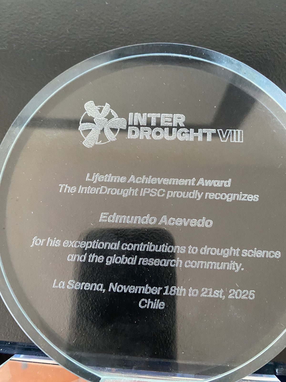 En la sesión de clausura del congreso internacional InterDrought VIII, realizado recientemente en la ciudad de La Serena y organizado, entre otras instituciones, por la Academia Chilena de Ciencias Agronómicas, el Académico de Número de la Academia (Sitial 2), Prof. Edmundo Acevedo Hinojosa, fue protagonista de una doble distinción: dictó la conferencia magistral de cierre del evento y recibió el importante “Premio a la Trayectoria”, que otorga el Congreso a quienes se distinguen o se han distinguido por sus aportes a la ciencia en relación con la sequía.