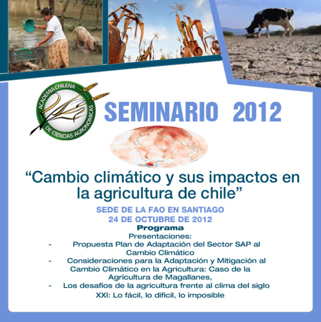 24 de octubre 2012 Presentaciones: – Propuesta Plan de Adaptación del Sector SAP al Cambio Climático, Daniel Barrera(P) – Consideraciones para la Adaptación y Mitigación al Cambio Climático en la Agricultura: Caso de la Agricultura de Magallanes, Laura Meza(P) – Los desafíos de la agricultura frente al clima del siglo XXI: Lo fácil, lo difícil, lo imposible, Fernando Santibáñez(P) – La ciencia agronómica frente al cambio climático,Nicolo Gligo V. (P)